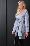 This top features an asymmetrical button-up front, collar neckline, long sleeves, and cinched with D-link belt. Accessories sold separately. 100% Cotton.