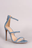 This fabulous heel features an open toe silhouette, triple skinny straps, wrapped stiletto heel, and denim fabrication throughout. Finished with a lightly cushioned insole and rear zipper closure for easy on/off.