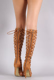 These eye-catching heels feature a soft vegan suede upper, corset style lace up wrap around, peep toe silhoutte, and wrapped stiletto heel. Finished with a lightly cushioned insole and rear zip-up closure for easy on/off.