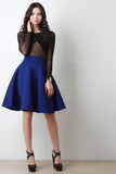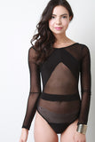 This bodysuit features a semi-sheer fabrication, contrasting panel construction, round neckline, scoop back, long sleeves, and brief bottom. Accessories sold separately. Made in U.S.A. 100% Polyester.