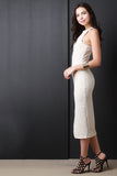 This midi length hemline with front slit. Accessories sold separately. Made in U.S.A. 96% Polyester, 4% Spandex.