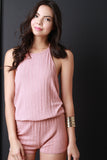 This romper features a texture ribbed knit fabrication, halter neckline with a self-tie back, backless drape construction, elasticized waist, and shorts bottom half. Accessories sold separately. Made in U.S.A. 55% Polyester, 40% Rayon, 5% Spandex.
