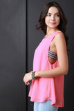 This sleeveless top features a wide woven tribal ribbon at armhole, round neckline, airy chiffon fabrication, trapeze cut fit, and finished with underlay. Accessories sold separately. Made in U.S.A. 100% Polyester.