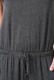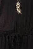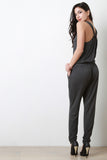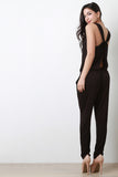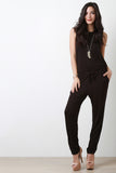 This jersey knit jumpsuit features round neckline, sleeveless, intertwist open back, , elasticized waist, side pockets, and taper cut legs. Accessories sold separately. 96% Rayon, 4% Spandex.