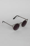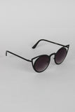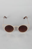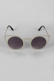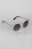 These sunglasses feature cat eye frames with cut out accents, polished mettalic frame, round lenses, and nose bridge cushions.