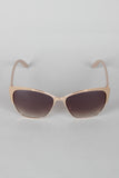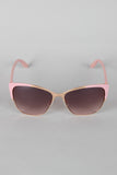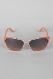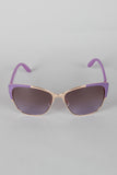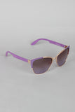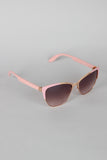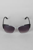 These sunglasses feature mod textured design, semi-rimless, slight cat eye construction, metallic bridge and frame, and nose bridge cushions.