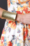 This beautiful cuff bracelet features burnished metallic frame with embossed filigree pattern throughout, flared construction, and open ends for easy on/off.