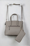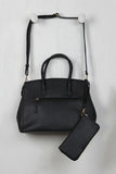 This handbag features pebbled vegan leather, gold-tone hardware, lock embellishment, and top zipper closure. Interior features pockets and full striped lining. Bag is finished with top handles (4.75" drop), removable shoulder strap (14.5" drop) and matching wallet clutch.