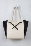 This chic tote bag features two-tone vegan leather, strap accents, and top snap button closure. Interior features single zipper pocket and multiple slip pockets. Bag is finished with top handles (9" drop).