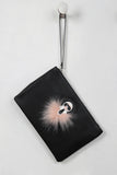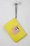 This adorable clutch features vegan leather, faux fur accent, and top zipper closure with wrist strap. Interior features pockets and full lining. Bag is finished with removable shoulder strap (20.5" drop).