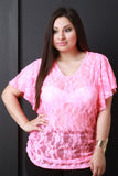 This top features a floral lace mesh pattern throughout, V neckline, short kimono sleeves, and finished with cinched side detailing. Accessories sold separately. Made in U.S.A. 92% Polyester, 8% Spandex.