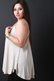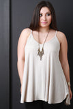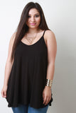This plus size top features a ribbed knit fabrication, v-neckline with spaghetti shoulder straps, sleeveless construction, raw side edge, and flare hemline. Accessories sold separately. Made in U.S.A. 95% Rayon, 5% Spandex.