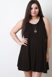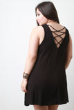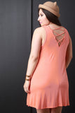 This plus size shift dress features a scooped neckline, sleeveless design, plunging V back with a strappy cage inset, and high-low hemline. Accessories sold separately. 95% Rayon. 5% Spandex.