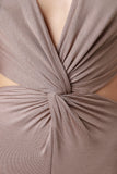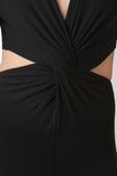 This jersey knit jumpsuit features a deep v neckline, sleeveless, twisted knot front, , elasticized waist, cut out back, exposed zipper closure, and taper cut legs. Accessories sold separately. 97% Modal, 3% Lycra.