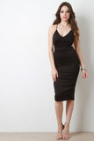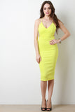 This bodycon dress features a backless design with thin spaghetti straps that cross the back, v neckline, midi hem, stretchy sculpture fit with a back zip closure. Made in U.S.A. Accessories sold separately. 96% Polyester 4% Spandex.