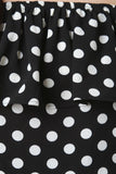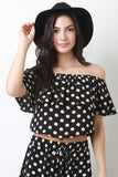This classical top feature a polka dot print fabrication, off the shoulder silhoutte, elasticized ruffled neckline, and short sleeve construction. Finished with a cropped elasticized hemline. Accessories sold separately. Made in U.S.A. 100% Polyester.