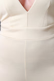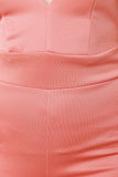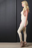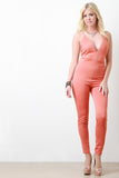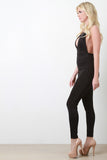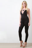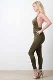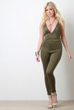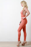 This chic jumpsuit features a deep v-neckline, spaghetti shoulder straps to a crisscross back, wide panel cinched seam, and taper cut legs. Accessories sold separately. Made in U.S.A. 95% Polyester, 5% Spandex.