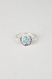 This dainty bohemian inspired ring features a brushed metal finish with a textures crescent moon surrounding a faux turquoise stone. Non-adjustable band.