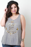 This plus size top features a "FIND YOUR ANCHOR" graphic metallic print, horizontal stripes design, scoop neckline, and sleeveless construction. Finished with crisscross straps at back. Accessories sold separately. Made in U.S.A. 75.6% Rayon, 24.4 Polyester.