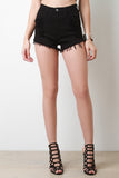 These denim shorts features high waist design, distressed patches detail at front, belt loops, four pockets, and zipper fly with single button closure. Finished with a frayed hem. Accessories sold separately. Made in U.S.A. 98% Cotton, 2% Spandex.