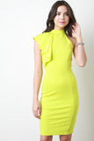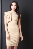 This bodycon dress features an asymmetrical design, one pleated flutter sleeve, mock neckline, body con fit, midi hemline, knit fabrication and an invisible zipper back closure. Accessories sold separately.Made in U.S.A. 65% Rayon, 30% Nylon, 5% Spandex.