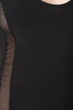 This backless dress features a sleeveless design, single strap across lower back, mesh inserts on sides, slim fit, elastic on back opening and knit fabrication. Accessories sold separately. Made in U.S.A. 96% Polyester 4% Spandex.