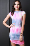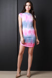 This tie dye knit fabrication, boat neck, short cap sleeve design, stretchy sculpture fit, and curved hem. Fully lined. Accessories sold separately. Made in U.S.A. Self: 95% Rayon, 5% Spandex. Lining: 95% Rayon, 5%