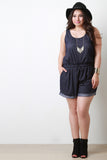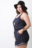 This denim throughout, scooped neck, elasticized waistline with adjustable drawstring, two side pockets, and cuffed hem shorts. Accessories sold separately. 92% Polyester, 8% Spandex.