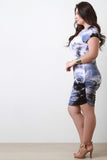 This plus size dress features a tie dye knit fabrication, scooped neck, short sleeves design, and stretchy bodycon fit with figure-flattering side ruching detail. Accessories sold separately. Made in U.S.A. 95% Rayon, 5% Spandex.