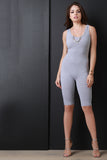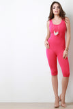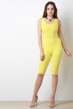 This casual romper features a jersey knit fabrication, scoop neckline and back, sleeveless construction, and figure hugging fit. Finished with a capri-length hemline. Accessories sold separately. Made in U.S.A. 98% Cotton, 2% Spandex.