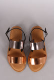 This eye-catching flat sandal features two tone metallic finish, double band across vamp, open toe silhouette, and slingback with adjustable buckle closure. Finished with a lightly padded insole.