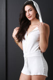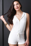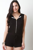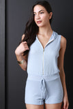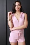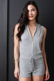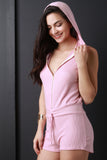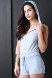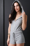 This jersey knit romper features thermal knit fabrication , zipper front, hoodie back, sleeveless, faux drawstring, relaxed fit. Accessories sold separately. Made in U.S.A. 95% Rayon, 5% Spandex.