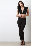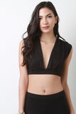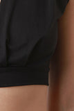 This top features a jersey knit fabrication, plunging v-neckline, pleated shoulder detail, sleeveless construction, and cropped banded hem. Finished with an exposed zipper fastener. Accessories sold separately. Made in U.S.A. 95% Polyester, 5% Spandex.