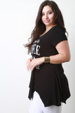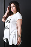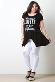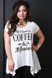 This plus size top features an "All I need is coffee & mascara" graphic print at front, jersey knit fabrication, cap sleeves construction, round neckline, and finished with a sharkbite hemline. Accessories sold separately. Made in U.S.A. 97% Rayon, 3% Spandex.