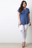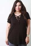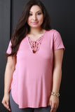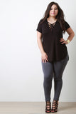 This plus size top features a jersey knit fabrication, deep v-neckline with crisscrossing strap lace-up design, and short sleeves construction. Finished with a rounded high low hemline. Accessories sold separately. Made in U.S.A. 97% Rayon, 3% Spandex.