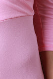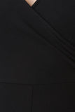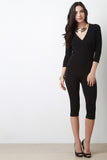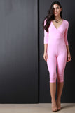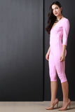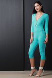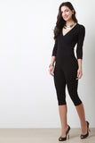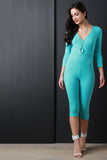 This casual romper features a jersey knit fabrication, wrap style with surplice neckline, three quarter sleeves construction, and high waist design. Finished with a carpi-length hemline. Accessories sold separately. Made in U.S.A. 92% Cotton, 8% Spandex.