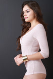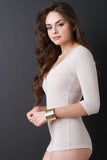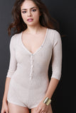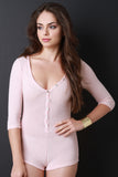 This romper features a ribbed knit fabrication, deep v-neckline with front buttons closure, and finished with a 3/4 sleeves construction. Accessories sold separately. Made in U.S.A. 95% Rayon, 5% Spandex.