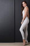 This vegan suede  jumpsuit  features mock neck, strappy open back, and tapered legs. Accessories sold separately. Made in U.S.A. 90% Polyester, 10% Spandex.