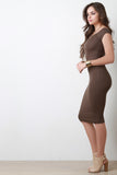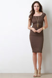 This dress features a ribbed knit fabrication, boat neckline, cap sleeve construction, and finished with a figure hugging fit and midi-length hemline. Accessories sold separately. Made in U.S.A. 95% Rayon, 5% Spandex.