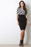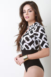 This bodysuit features an abstract chains print top, mock neckline with front zip-up closure, elbow sleeves, and contrasting brief bottom. Accessories sold separately. Made in U.S.A. 95% Polyester, 5% Spandex.