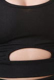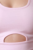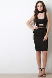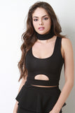 This sexy crop top features textured knit, collar neck strap with double button closure at nape, u-neckline, cut out design, and sleeveless construction. Accessories sold separately. Made in U.S.A. 95% Polyester, 5% Spandex.