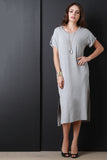 This midi length t-shirt dress features a round neckline, short cuff sleeves, jersey knit fabrication, side vent slits, and hidden side pockets. Accessories sold separately. Made in U.S.A. 95% Rayon, 5% Spandex.