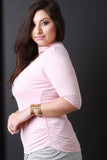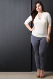 This plus size top features soft jersey knit, mock neck, cutout with criss-cross lace design, half sleeves, and ruched sides. Accessories sold separately. 97% Rayon, 3% Spandex.
