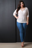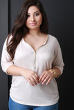 This plus size top features rib knit, zip-up neck, dolman sleeves, and ruched sides. Accessories sold separately. 88% Rayon, 12% Polyester.