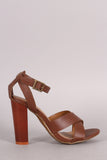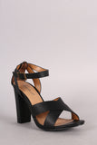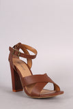 This classical heel features crisscross straps across vamp, an open toe silhouette, ankle cuff, and faux wooden chunky heel. Finished with a lightly cushioned insole and side buckle closure.