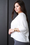 This plus size top features a v-neckline with plunging back design, three-quarter dolman sleeve construction, and high-low hemline. Accessories sold separately. Made in U.S.A. 95% Rayon, 5% Spandex.