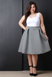 This cute plus size skirt features a double knit fabrication, box pleat details, a midi length hem and a skater skirt silhouette. Accessories sold separately. Made in U.S.A. 95% Polyester 5% Spandex.