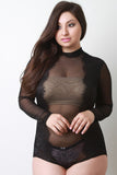 This plus size bodysuit features semi sheer mesh fabrication, mock neck, long sleeves, lace applique, back key hole with button closure at nape. finished with a double snap at crotch. Accessories sold separately. Made in U.S.A. 97% Polyester, 3% Spandex.