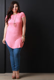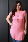 This top features a ribbed knit fabrication, round neckline, cap sleeves, and finished with a long rounded hemline. Accessories sold separately. Made in U.S.A. 96% Rayon, 4% Spandex.