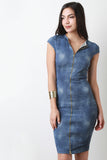 This casual dress features faux denim knit, zip-up front, cap sleeves, and midi length. Accessories sold separately. 88% Polyester, 12% Spandex.